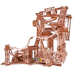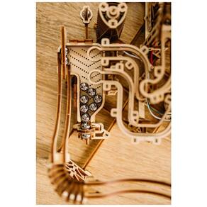Inspirado em uma máquina de movimento perpétuo, este quebra cabeça de mármore é uma montanha russa equipada com um motor elétrico alimentado por 4 pilhas AA de 1,5V não inclusas no kit . Não há nada que impeça a jornada das bolinhas de gude