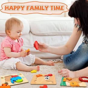 PRODUTO INTERNACIONAL - As quebra-cabeças em madeira Xixiland para crianças vêm em um conjunto de 6 com formatos de animais: elefante, caranguejo, abelha, leão, coruja e tartaruga.