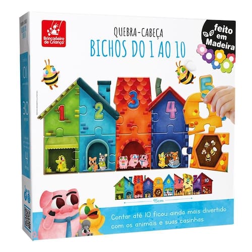 contar até 10 ficou muito mais divertido com os animais e suas casinhas são 10 casinhas contendo nelas a quantidade certa de bichos. Você irá encontrar gatos, abelhas, cachorros, galinhas ente outos bichos fofos. Além da arte rica em detalhes, o quebra-cabeça facilita no aprendizado matemático, por conter tembém números para encaixar. - marca: brincadeira de criança - dimensões: 25,5 x 26,5 x 4 cm - e lacrado - contém: 1 quebra-cabeça com 30 peças em mdf, dentre elas, números para encaixar - faixa etária: indicado para crianças à partir de 4 anos. - ean: 7898565511474 - certificado pelo inmetro ce-bri/ocp 0133 registro 006333/2021