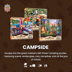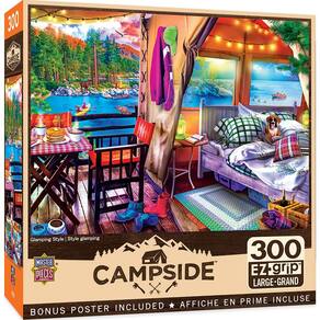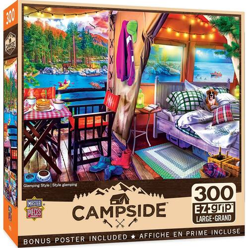MasterPieces - Quebra-cabeça de 300 peças, formas grandes de aderência EZ, estilo glamping, divertido para adultos, idosos, família, crianças, acabamento sem brilho, 46 x 61 cm - PEÇAS EXTRA GRANDES: Nossos quebra-cabeças EZ Grip apresentam peças grandes e mais grossas para facilitar a coleta e manipulação; cuidadosamente trabalhados com crianças pequenas e idosos em mente; projetados para serem divertidos e mentalmente estimulantes; ajudam no relaxamento; aumentam as habilidades de resolução de problemas; ótima atividade social com a família e amigos - Formas exclusivas: o quebra-cabeça possui 300 peças em uma variedade de cortes, garantindo um desafio; peças entrelaçadas se encaixam para um ajuste seguro; acabamento fosco antirreflexo reduz o cansaço visual; um pôster vibrante e colorido está incluído para referência enquanto você o monta - Responsável pelo meio ambiente: nossos quebra-cabeças são feitos de material 100% reciclado e tintas à base de soja não tóxicas - Entretenimento para todos: a coleção MasterPieces oferece a maneira perfeita de manter a diversão noturna do jogo; selecione entre quebra-cabeças para adultos, idosos e crianças; baralhos exclusivos de baralho, jogos de tabuleiro, dominó, kits de artesanato e muito mais