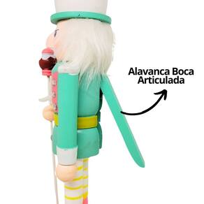 Adicione um toque lúdico e festivo à sua decoração com este boneco quebra-nozes temático no estilo candy! Com 30 cm de altura, ele é confeccionado em madeira e pintado em vibrantes tons de verde, rosa e lilás, proporcionando charme e cor à sua decoração natalina. Sua boca articulada é um detalhe clássico que traz autenticidade à peça.