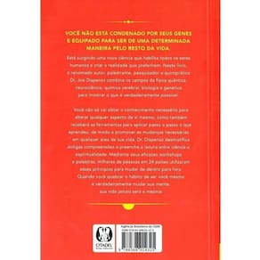 Você não está condenado por seus genes e equipado para ser de uma determinada maneira pelo resto da vida. Está surgindo uma nova ciência que habilita todos os seres humanos a criar a realidade que preferirem. Neste livro, o renomado autor, palestrante, pesquisador e quiroprático Dr. Joe Dispenza combina os campos da física quântica, neurociência, química cerebral, biologia e genética para mostrar o que é verdadeiramente possível. Você não só vai obter o conhecimento necessário para alterar qualquer aspecto de si mesmo, como também receberá as ferramentas para aplicar passo a passo o que aprendeu, de modo a promover as mudanças necessárias em qualquer área de sua vida. Dr. Joe desmistifica antigas compreensões e preenche a lacuna entre ciência e espiritualidade. Quando você quebrar o hábito de ser você mesmo e verdadeiramente mudar sua mente, sua vida jamais será a mesma!