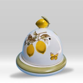 Torne seu café ainda mais especial com a queijeira da nova coleção Limaocello Luiz Salvador. Tampa de limão com borboletas e na base interna também estampada, com lateral pintada à mão na cor verde claro. Material: Peças em Cerâmica faiança, artesanal de fabricação nacional, não refratária, produzida de acordo com as tradições da Indústria ceramista de Alcobaça / Portugal. Tamanho: 0 x H cm = 20 x 16 Cuidados com a peça: lavar com esponja macia e sabão neutro Ean: 7898708612389