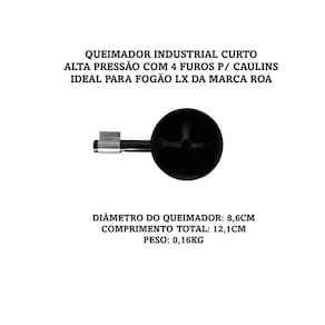 Queimador industrial curto sem caulim e com 4 furos> Ideal para Fogões modelo LX pintado da marca ROA <Especificações:Marca: RoaLinha: Queimador para FogãoCor: Preto - Pintura EletrostáticaSem caulins (04 buracos disponíveis)Funcionamento: Gás GLPDiâmetro do queimador: 86mmComprimento total: 121mmPeso: 0,16KgEmbalagem: 01 Queimador Industrial de Alta Pressão Fogões Lx Roa.