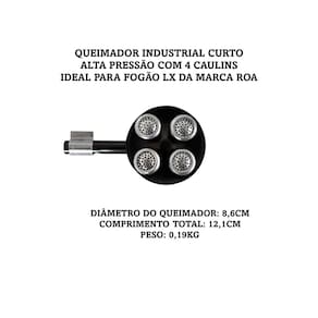 Queimador Industrial Curto de Alta Pressão > Ideal para Fogões modelo LX da marca ROA <Especificações:Marca: RoaLinha: Queimador para FogãoCor: Preto - Pintura EletrostáticaCaulins (chuveirinho onde sai a chama): 04Funcionamento: Gás GLPDiâmetro do queimador: 86mmComprimento total: 121mmPeso: 0,19KgEmbalagem: 01 Queimador Industrial de Alta Pressão Fogões Lx Roa.
