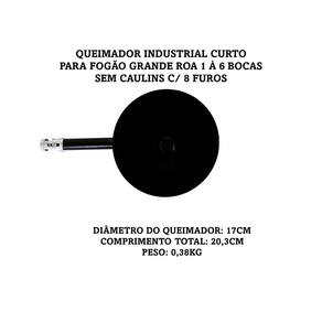 Queimador Industrial Curto com 8 Furos (sem Caulins) para Fogão Grande Roa de 1 a 6 BocasMarca: ROALinha: Queimadores sem CaulimCor: PretoDiâmetro: 17cmComprimento: 20,3 cm (a medida é do parafuso de encaixe até o final do tubo)Tubo de 12 cmPeso: 0,38 KgModelos compatíveis: Fogão Grande Alta Pressão da ROA de 1 a 6 Bocas.