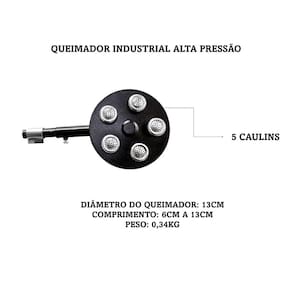 Queimador Industrial Curto Regulável 6 a 13cm > Ideal para Fogões ROA <Especificações:Marca: RoaLinha: Queimador para FogãoCor: Preto - Pintura EletrostáticaCaulins (chuveirinho onde sai a chama): 05Funcionamento: Gás GLPDiâmetro do queimador: 130mmComprimento total: 13mmPeso: 0,34 KgEmbalagem: 01 Queimador Industrial de Alta Pressão Fogões Roa.