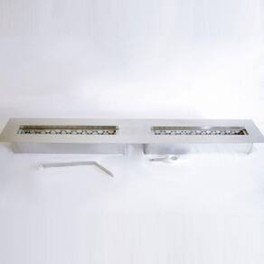 MODELO QUEIMADOR 120CM - Área de aquecimento : 70m² - Quantidade álcool no reservatório: 2,5L (cada reservatório) - Espessura chapa: 3mm - Modelo da tampa: Com regulagem para chama - Acabamento do tampo: Aço inox escovado - Dimensões: 14cm (largura) x 120cm (comprimento) x 08cm (altura) - Tempo de aquecimento estimado: 1,5h à 2,5h - Material do queimador: INOX 304 - Recorte no nicho para instalação: 12cm x 116cm - Revestimento interno: Manta cerâmica