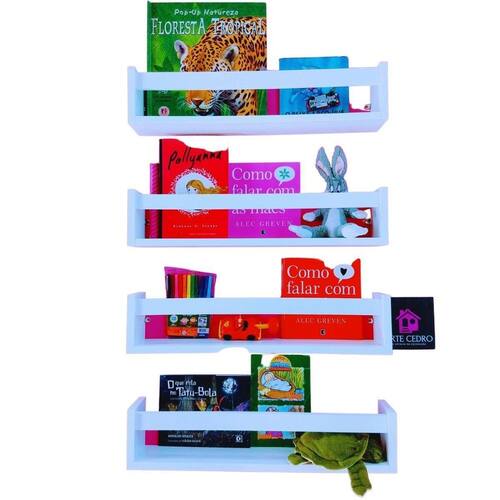 Quit Prateleiras Organizadoras De Livros De Criança Estante Livreiro 4un55cm Prateleiras enviadas montadas para você, de acabamento perfeito. Qualidade comprovada por nossos clientes Fabricação Arte Cedro decor O que vem Kit com 4 prateleiras porta livros e multiuso brancas. Kit instalação do produto. Decora o quarto do seu bebê com sofisticação e beleza. Organiza seus ambientes. Incentiva a criança á leitura. Pode ser instalado em várias posições de acordo com sua necessidade. Produto versátil, perfeito para qualquer ambiente, quarto, cozinha, banheiro etc. Fácil instalação, bastando fixar na parede. Suporta até 8 kilos. Material 100% MDF 15 mm. Acabamento real do mdf, superior á pintura em qualidade e durabilidade Produzido com fita de borda em PVC, incomparável ás de papel utilizadas no mercado. MEDIDAS 55 CM comprimento 12 CM altura 10 CM largura Marca: Arte Cedro Ean: 7790011400014