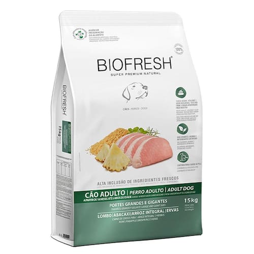 Ração Para Cão Adulto Portes Grandes E Gigantes Sabor Lombo Abacaxi E Arroz Integral E Ervas 15kg Biofresh A Ração Cão Adulto Portes Grandes e Gigantes Sabor Lombo e Abacaxi 15kg Biofresh é formulada especialmente para cães adultos de raças grandes e gigantes. Com um sabor único de lombo e abacaxi, oferece uma refeição equilibrada e nutritiva, com ingredientes frescos e naturais que favorecem a saúde do pet. Sua fórmula rica em proteínas de alta qualidade contribui para o fortalecimento muscular e o bom funcionamento das articulações, além de auxiliar na manutenção de uma pele saudável e uma pelagem brilhante. Ideal para cães grandes que necessitam de uma alimentação que atenda suas necessidades energéticas e de vitalidade.