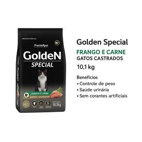 Ração Golden Special Gatos Castrados 10,1kg Frango Carne Ração Golden Special Gatos Castrados Sabor Frango e Carne 10,1kg A Ração Golden Special Gatos Castrados é desenvolvida especialmente para atender as necessidades nutricionais de gatos adultos castrados. Sua fórmula completa e balanceada oferece o equilíbrio ideal entre sabor e saúde, garantindo uma alimentação de qualidade premium para o seu pet. Com proteínas de alta qualidade, como frango e carne, esse alimento auxilia na manutenção da massa muscular, promove energia e contribui para a saúde geral do gato. Além disso, contém ingredientes selecionados que ajudam no controle do peso, fundamental para gatos castrados, que tendem a ter metabolismo mais lento. A Golden Special também contribui para a saúde intestinal, proporcionando fezes com melhor consistência e menor odor, e auxilia na saúde da pele e dos pelos, deixando-os mais bonitos e brilhantes. Benefícios da Ração Golden Special Gatos Castrados 10,1kg: