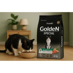 Ração Golden Special Gatos Castrados 10,1kg Frango Carne Ração Golden Special Gatos Castrados Sabor Frango e Carne 10,1kg A Ração Golden Special Gatos Castrados é desenvolvida especialmente para atender as necessidades nutricionais de gatos adultos castrados. Sua fórmula completa e balanceada oferece o equilíbrio ideal entre sabor e saúde, garantindo uma alimentação de qualidade premium para o seu pet. Com proteínas de alta qualidade, como frango e carne, esse alimento auxilia na manutenção da massa muscular, promove energia e contribui para a saúde geral do gato. Além disso, contém ingredientes selecionados que ajudam no controle do peso, fundamental para gatos castrados, que tendem a ter metabolismo mais lento. A Golden Special também contribui para a saúde intestinal, proporcionando fezes com melhor consistência e menor odor, e auxilia na saúde da pele e dos pelos, deixando-os mais bonitos e brilhantes. Benefícios da Ração Golden Special Gatos Castrados 10,1kg: