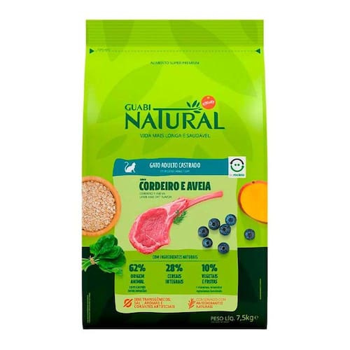 Ração Guabi Natural Gato Adulto Castrado Cordeiro e Aveia - 7,5Kg - Indicado para gatos castrados; - Equilíbrio corporal; - Proteção para o organismo; - Saúde e qualidade de vida. A Ração Guabi Natural Gato Castrado Cordeiro e Aveia é um alimento Super Premium feito com carnes selecionadas e ingredientes essenciais, que contribuem para qualidade de vida do seu gatinho. Além disso, foi desenvolvido por especialistas em nutrição e aprovado por veterinários para fornecer muito sabor e toda qualidade e saúde para os felinos castrados. Sem transgênicos, corantes e aromas artificias, Guabi Natural Gato CAstrado, tem o saboroso sabor de Cordeiro e Aveia. Condição corporal equlibrida, com elevada quantidade de carnes e proteínas exclusivamente animais que proporcionam os nutrientes essenciais para a adequada condição corporal de cada fase de vida. COMPOSIÇÃO Seleção de Ingredientes de Origem Animal, mín. 62% (dos quais mín. 16% são Carnes Selecionadas: Carne de Cordeiro, Carne Mecanicamente Separada de Frango e Fígado de Frango; Farinha de Vísceras de Aves, Farinha de Torresmo "Proteína Isolada de Suíno", Ovo em Pó, Gelatina "Colágeno Hidrolisado", Óleo de Vísceras de Aves, Gordura Suína, Óleo de Peixe Refinado, Hidrolisado de Fígado Ave e Suíno). Seleção de Cereais Integrais, mín. 28% (Arroz Integral, Grão de Aveia, Cevada em Grão, Grão de Sorgo). Seleção de Frutas, Vegetais, Vitaminas, Minerais e Ingredientes Funcionais, máx. 10% (dos quais máx. 5% são Frutas e Vegetais Selecionados: Ervilha, Brócolis Desidratado em Pó, Espinafre Desidratado, Cenoura Desidratada, Extrato de Mirtilo "Blueberry", Amora Desidratada, Maçã Desidratada, Manga Desidratada, Polpa de Beterraba, Farinha da Alga Schizochytrium sp., Semente de Psyllium, Fibra de Cana-de-Açúcar, Casca de Aveia, Levedura Seca de Cervejaria, Óleo de Linhaça; Cloreto de Sódio "Sal Comum", Cloreto de Potássio, Carbonato de Cálcio; Aditivos Prebióticos, mín. 0,35%: Inulina e Parede Celular de Levedura Fonte de Mananoligossacarídeos; Concentrado de Tocoferóis mín. 0,08%, L-Lisina, Taurina, DL-Metionina, L-Carnitina, Propionato de Cálcio, Sorbato de Potássio, Aditivo Adsorvente, Aditivo Acidificante; Vitaminas: A, D3, E, K3, C, B1, B2, B6, B12, Ácido Pantotênico, Ácido Fólico, Niacina, Biotina, Cloreto de Colina; Minerais: Sulfato de Zinco, Sulfato de Ferro, Sulfato de Manganês, Iodato de Cálcio, Selenito de Sódio; Minerais Quelatados: Proteinato de Manganês, Levedura Enriquecida com Selênio, Proteinato de Zinco, Proteinato de Cobre).