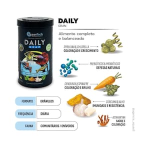Ração Ocean Tech Daily Gran 125g Oceantech Daily Gran é um alimento completo e balanceado, formulado para atender as necessidades nutricionais das mais diversas espécies de peixes ornamentais em aquários comunitários. Sua formulação possui proteínas de origem animal e vegetal de alta qualidade, fornecendo a qualidade necessária de aminoácidos para o desenvolvimento dos animais. Isso torna o alimento mais nutritivo e palatável, evitando sobras no fundo do aquário.