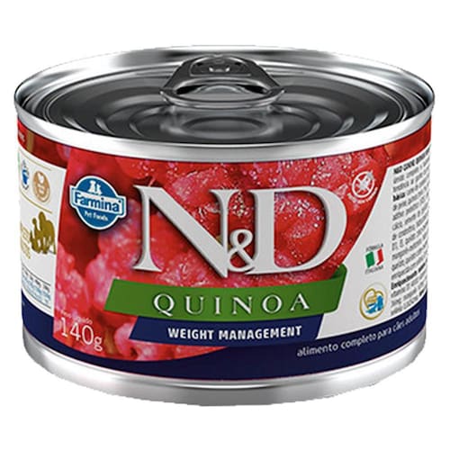 Ração Úmida N&D Lata Cães Quinoa Weight Cordeiro 140gDESCRIÇÃO: Ração Úmida Lata Farmina N&D Quinoa Weight Management para Cães Adultos foi desenvolvida para suprir as necessidades de vitaminas e nutrientes na alimentação do seu amigão, proporcionando vitalidade e qualidade de vida.APRESENTAÇÃO:Lata de 140g.MARCA:FarminaPRODUTO PARA USO ANIMAL.ORIENTAÇÕES:Conservar em local seco, fresco, ao abrigo da luz solar e fora do alcance de crianças e animais.Armazenar entre 15C a 30C.Não guardar o produto junto de alimentos, bebidas, produtos de higiene ou domésticos.Leia a bula ou informações descritas na embalagem.Foto Meramente ilustrativa.Descrição sob responsabilidade do fabricante, retirada diretamente do site do fabricante ou do próprio rótulo do produto.Caso haja diferença entre as informações aqui apresentadas e rótulo ou bula, prevalecerá sempre a informação do rótulo ou bula que acompanha o produto.