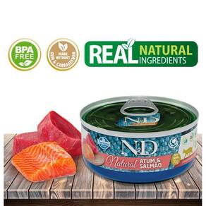 Ração Úmida N&D Natural Atum e Salmão para Gatos Adultos - 70Gr Descrição Completa do Produto: A Ração Úmida N&D Natural Gatos Adultos Atum e Salmão é uma opção premium de alimento úmido, especificamente desenvolvida para gatos adultos. Indicada como complemento da alimentação diária, esta ração proporciona 25% da ingestão diária de calorias recomendada, garantindo uma nutrição equilibrada para o seu felino.