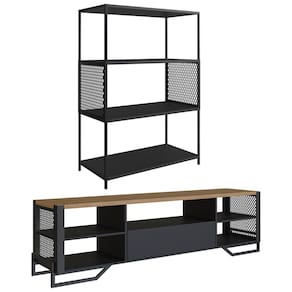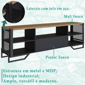 Rack 180 Cm Gaveta Estante 77 Cm Industrial 17X24, é ideal para acrescentar à sua sala um toque especial de design, com muita qualidade. Estrutura em MDP e metal, sendo o tampo do rack de 30 mm, prateleiras (de ambos) e gaveta de 15 mm, base de tubo em metal de 20 mm para o rack, que conta também com 05 prateleiras e ampla gaveta de corrediças telescópicas. A estante possui 03 prateleiras e ambos contam com tela de aço expandido. O peso suportado pelo rack e pela estante é de 30 kg e 40 kg, respectivamente. 02 móveis que em conjunto irão valorizar muito seu ambiente, com sua presença marcante e design em alta. Estes móveis chegarão na sua casa separados em 03 volumes.