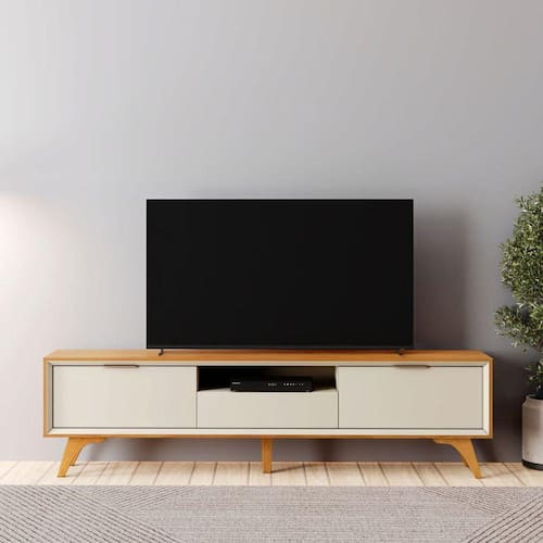 Faz parte do anúncio: 1 Rack 3 Gavetas Moderno 2,20m - Viena - Mavau Móveis Obs. Objetos de decoração não inclusos
