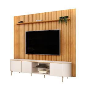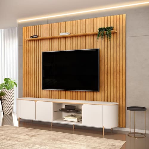 produto. Acabamento: Pintura UV Acabamento da Porta: Pintura UV Acabamento da Prateleira: Vidro Acabamento dos Pés: Pintura Altura do Painel: 240 cm Altura do Rack: 57 cm Altura dos Pés: 5 cm Ambiente Principal: Sala de Estar Complexidade da Montagem: Alta: deve ser montado por um montador especializado Cor: Off White/Cedro Cor do Produto: Off White/Cedro Escala de Brilho: Semi-Brilho Escala de Brilho da Porta: Semi-Brilho Escala de Brilho da Prateleira: Não Possui Espessura do Painel: 19 cm Espessura do Vidro: 6 mm Ideal para TVs até (Polegadas): 75 Itens Inclusos: 1 Rack + 1 Painel + 1 Manual de Montagem Largura do Painel: 275,7 cm Largura do Rack: 241 cm Manual de Montagem e Instalação: https://cdn2.madeiramadeira.com.br/atributo/dj-moveis/2651274-5316-17380706927261.pdf Marca: Dj Móveis Material da Porta: MDF Material da Prateleira: Vidro Material do Puxador da Porta: MDF Material dos Pés: Metal Material Principal: MDF/MDP Necessita Montagem: Sim Peso do Painel: 90,05 kg Peso do Rack: 52,7 kg Peso Máximo por Prateleira: 2 kg Possui Espelho: Não Possui iluminação: Não Possui Pés: 05 Possui Portas: Sim Possui Prateleiras: Sim Possui Tomada: Não Possui Vidro: Sim Profundidade do Rack: 45 cm Quantidade de Nichos: 04 Recomendações de Uso, Manutenção e Limpeza: Para manter seu móvel novo por muito mais tempo, evite locais úmidos, mantenha-o distante de líquidos e de fontes de calor. Evite aexposição prolongada ao sol. Para limpá-lo com segurança utilize uma flanela seca sem produtos abrasivos e nem lustra móvei Sapatas Niveladoras: Sim Sistema de Montagem: Minifix, cavilhas e parafusos Suporte de TV Universal Incluso: Não Tipo de Dobradiça/Corrediça da Porta: Metálica Tipo de Puxador da Porta: Embutido