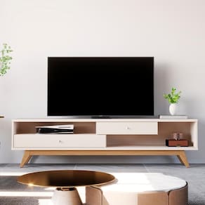 Produzido em MDF resistente com pés de madeira maciça, acomoda TVs de até 75, garantindo estilo e funcionalidade.