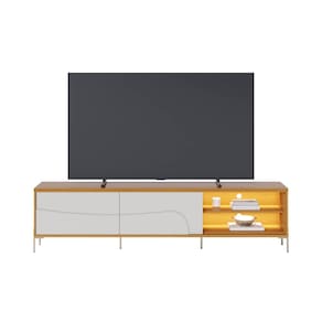 Características: Estrutura em MDF e MDP Acabamento em pintura UV Tampo Duplo com acabamento chanfrado Nicho com Led e Prateleira 02 Portas Deslizantes Portas com Relevo Orgânico Pés em Metal Dourado Pés centrais com Sapata Niveladora Bancada Suporta até 50 kg Ideal para TV até 75 Polegadas NÃO ACOMPANHA TV