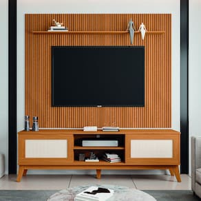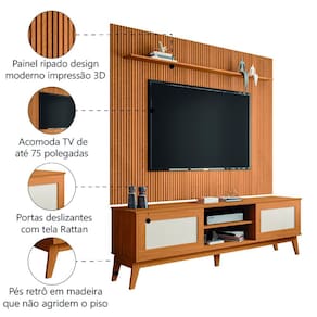 O Conjunto Rack Bancada Cairo com Painel Avante é a definição de elegância e sofisticação! Conta com espaço para aparelhos eletrônicos, prateleiras, 2 portas deslizantes com amplo espaço interno e acabamento em tela Rattan sintética, painel com detalhe ripado em impressão 3D e pés resistentes de madeira. Feito com materiais de qualidade garantindo maior resistência e durabilidade. Acomoda TV de até 75 polegadas.