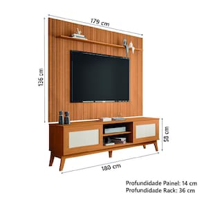MEDIDAS PAINEL: [ A ] = 136 cm [ L ] = 179 cm [ P ] = 14 cm MEDIDAS PRATELEIRA: [ A ] = 1,2 cm [ L ] = 136 cm [ P ] = 12 cm MEDIDAS RACK: [ A ] = 58 cm [ L ] = 180 cm [ P ] = 36 cm MEDIDAS DOS PÉS: [ A ] = 22 cm [ L ] = 6,5 cm [ P ] = 2,5 cm ACOMODA TV ATÉ: 75 polegadas PESO DO PAINEL: 26,39 Kg PESO SUPORTADO PELO PAINEL: 32,8 Kg PESO DO RACK: 26,45 Kg PESO SUPORTADO PELO RACK: 35 Kg MODELO: Rack Bancada Cairo Com Painel Para TV Até 75 Polegadas 1,79m Avante Ripado Impressão 3D COR: Cedro MARCA: EDN ACABAMENTO: Pintura UV MATERIAL DO PAINEL: MDP MATERIAL DO RACK: MDP/MDF ESPESSURA DO MATERIAL DA ESTRUTURA: 12 e 15mm PORTAS: 2 TIPO DE PORTA: Correr PRATELEIRAS: 2 PÉS: 5 MATERIAL DOS PÉS: MDF GARANTIA: 3 meses pelo fabricante DIFERENCIAL: Tampo do Rack em MDF com borda laqueada, porta deslizante com acabamento em moldura e tela Rattan sintética, painel com detalhe ripado 3D, prateleiras, trilhos em ABS, acomoda TV e objetos decorativos. ITENS INCLUSOS: 1 Rack Bancada, 1 Painel, 1 manual de Montagem e 1 Kit de ferragens INSTRUÇÕES/CUIDADOS: Para maior durabilidade, recomendável que a limpeza dos móveis seja feita com pano limpo e levemente umedecido em água e sabão neutro. Em seguida, deverá ser passado um pano limpo e seco.