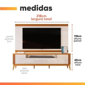 Importante sobre a entrega: A entrega é realizada até a portaria ou porta de entrada do endereço indicado, desde que o acesso seja permitido. Para locais com portaria, a entrega será feita no piso térreo. Não realizamos montagem, desmontagem, transporte por escadas ou içamento. É responsabilidade do cliente verificar se as dimensões do produto são compatíveis com portas, elevadores e corredores. Evite imprevistos: confira todos os detalhes antes de concluir sua compra. MEDIDAS BANCADA:: A = 60 cm L = 218 cm P = 42 cm | MEDIDAS NICHO BANCADA:: A = 18 cm L = 121,4 cm | MEDIDA PÉS BANCADA:: A = 20 cm | MEDIDAS PAINEL:: A = 118 cm L = 218 cm P = 5 cm | GAVETAS SUPORTAM ATÉ:: 4 kg | NICHO SUPORTA ATÉ:: 4 kg | BANCADA SUPORTA ATÉ:: 30 kg | PESO PAINEL:: 35 kg | PESO BANCADA:: 42 kg | PAINEL SUPORTA ATÉ:: 35 kg | IDEAIS PARA TV DE ATÉ:: 75 Polegadas | MODELO:: Rack Bancada com Painel Detalhe Ripado Vetro Para TV Até 75 Polegadas 2,18m | MARCA:: EDN Móveis | PINTURA:: Pintura UV de alta qualidade | TIPO DE PORTA:: Bater | COR:: Madeirado/Off White | ACABAMENTO:: Semi brilho / fosco | PORTAS:: 2 | MATERIAL DA ESTRUTURA:: MDF/MDP | ESPESSURA DA ESTRATURA:: 15 e 25mm | PUXADORES:: Cava | GAVETAS:: 2 | NICHOS:: 1 | MATERIAL DOS PÉS:: Madeira maciça | DIFERENCIAIS:: Design moderno e elegante com detalhes ripado / 2 Gavetas com corrediças telescópicas / Pés bancada em madeira maciça / Suportam TV de até 75. | INSTRUÇÕES E CUIDADOS:: Para maior durabilidade, recomendável que a limpeza dos móveis seja feita com pano limpo e seco. Não usar produtos químicos ou abrasivos. | DOBRADIÇAS:: Pressão | CORREDIÇAS:: Telescópicas | PÉS:: 6 | ITENS INCLUSOS:: 1 painel, 1 rack bancada, 1 manual de montagem, 1 kit parafusos | GARANTIA:: 3 meses pelo fabricante. | AVISO:: Importante sobre a entrega: A entrega é realizada até a portaria ou porta de entrada do endereço indicado, desde que o acesso seja permitido. Para locais com portaria, a entrega será feita no piso térreo. | Altura: 60 cm | Largura: 218 cm | Profundidade: 42 cm | Inclui manual de montagem: Sim | Quantidade de caixas de embalagem: 2 | Requer montagem: Sim | Altura da embalagem: 28700 cm | Comprimento da embalagem: 22820 cm | Largura da embalagem: 51200 cm | Peso da embalagem: 92800 g | Tipo da embalagem: sem embalagem adicional | Cor: Madeirado/Off White