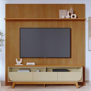 O Rack Bancada com Painel New Luna é a combinação do Painel New Guaporé e o Rack Bancada Selene, ideal para quem busca inovação na decoração da sala. O Painel Piso-Teto New Guaporé, em MDF e MDP com pintura UV, possui design frisado, prateleira superior e fixação na parede, garantindo um visual moderno e elegante, ideal para até 75. Já o Rack Bancada Selene se destaca pelo design refinado, com estrutura em MDP, 3 gavetas com corrediças telescópicas para organização eficiente e detalhe curvo nas gavetas laterais. Seu tampo suspenso de 25mm com borda chanfrada e pés usinados trazem um toque sofisticado. Ideal para quem busca estilo e praticidade.