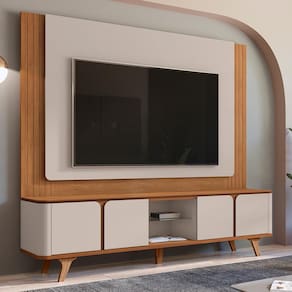 Rack Bancada com Painel Suspenso Roma 217cm para TV até 60 - Casa D O Rack Bancada com Painel Suspenso Roma de 217cm é a escolha ideal para quem busca funcionalidade e funcionalidade na sala de estar. Com estrutura em MDP e MDF, acabamento em pintura UV e detalhes sofisticados como painéis laterais frisados ??e cantos arredondados, este conjunto oferece um design moderno e refinado. O rack contém quatro portas com dobradiças metálicas, prateleira de vidro de 6mm e pés em madeira sólida, garantindo resistência e praticidade. Já o painel suspenso foi desenvolvido para fixação na parede, proporcionando um visual limpo e organizado, além de contar com passa-fios para esconder os cabos. Ideal para TV até 60, esse conjunto transforma qualquer ambiente em um espaço sofisticado e funcional.