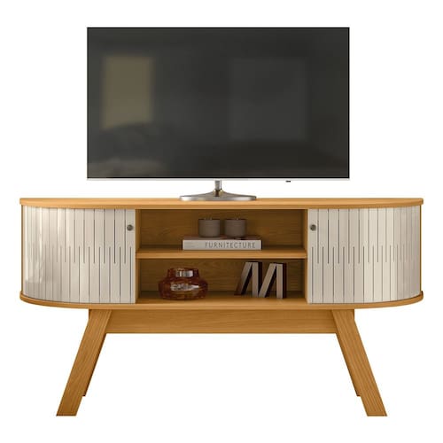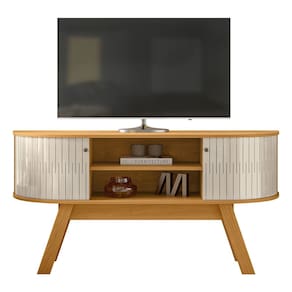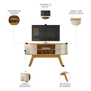 Características do Produto Material da Estrutura: MDP/MDF. Espessuras das Chapas: 15mm/ 25mm. Peso Suportado: 50 Kg. Acabamento: Pintura UV. Escala de Brilho: Brilho/Fosco. Suporta TV de até: 55 Polegadas. Possui Prateleiras: Sim. Quantidade de Prateleiras: 1 Prateleira. Possui Portas: Sim. Quantidade de Portas: 2 Portas. Material da Porta: MDP. Tipo de Porta: Deslizante. Possui Gavetas: Não. Possui Puxador: Sim. Material dos Puxadores: Poliestireno. Possui Nicho: Não. Possui Espelho: Não. Possui Pés: Sim. Quantidade de Pés: 4 Pés. Tipo de Pés: Pés Palito. Material dos Pés: Madeira. Diferenciais: - Portas deslizantes. - Detalhes curvos. - Pés palito. Sistema de Montagem: Cavilhas/Parafusos/Minifix. Manual de Montagem: Sim. Complexidade da Montagem: Alta. Volumes: 1 Volume. Conteúdo da Embalagem: 1 Rack. Garantia do Fabricante: 90 dias contra defeito de fabricação. Montagem: Recomendamos que seja feita por um profissional. Recomendação de Limpeza: Utilize pano levemente úmido.
