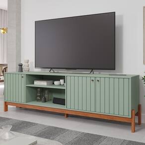 Rack Bancada Holanda 205cm Sálvia/cinamomo Para Até 70 - Permóbili Sálvia/cinamomo Rack Bancada Holanda 205cm para até 70 - Permóbili Transforme sua sala de estar com o Rack Bancada Holanda 2055cm. Com 3 portas com dobradiças em slow motion, garantindo um fechamento suave e detalhes em efeito 3D ripado, que adicionam um toque sofisticado ao design. Os puxadores na cor cobre complementam a estética moderna, enquanto os pés em MDF apresentam estabilidade e modernidade. Transforme seu ambiente com funcionalidade e design. ESPECIFICAÇÕES: - Estrutura em MDF - Pintura UV - 3 Portas - Dobradiças slow motion - Detalhe nas portas com efeito 3D ripado - Puxadores na cor cobre - Prateleira - Pés em MDF - Ideal para até 70