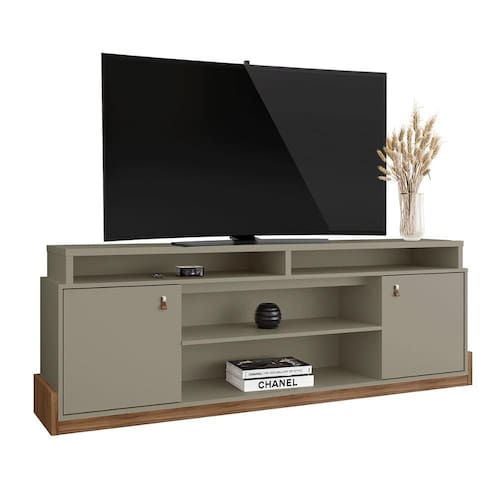Comporta TVs de até 75 e traz design moderno com nichos amplos, 2 portas com puxadores elegantes e rodízios embutidos que facilitam a movimentação.