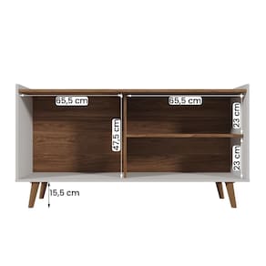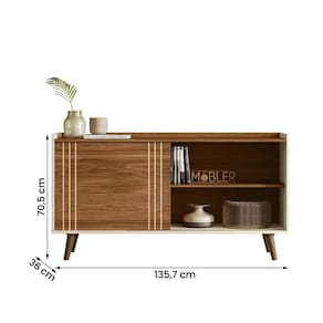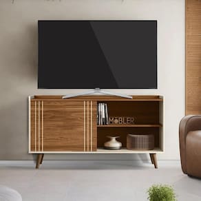 Possui porta de correr com trilho suave, nichos para objetos decorativos e estrutura em MDP/MDF resistente.