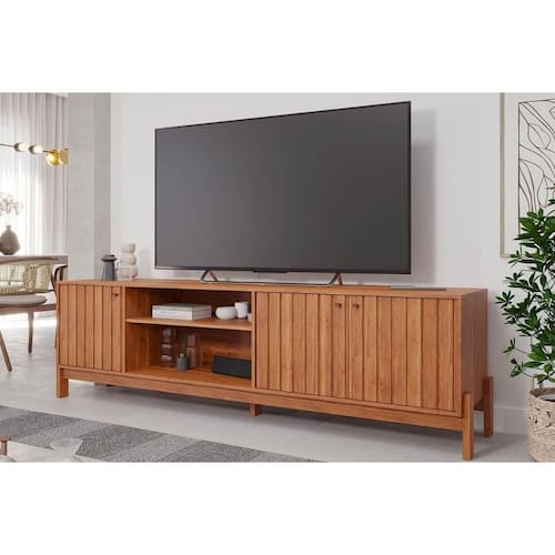 Tipo de Porta - Portas de Bater Material p/ Abertura Portas - Dobradiça Pressão Metálica 35mm Diferenciais das Portas - Portas Ripadas Quantidade de Portas - 2 Portas de Abrir Tipo de Puxador - Puxador em ABS / PVC Cromado Tipo de Dobradiças - Dobradiças Slowmotion Quantidade de nichos - 2 Nichos Ideal para TVs até (Polegadas) - 70 Tipo dos Pés - Pés de Madeira Quantidade de Pés - Móvel possui 5 pés