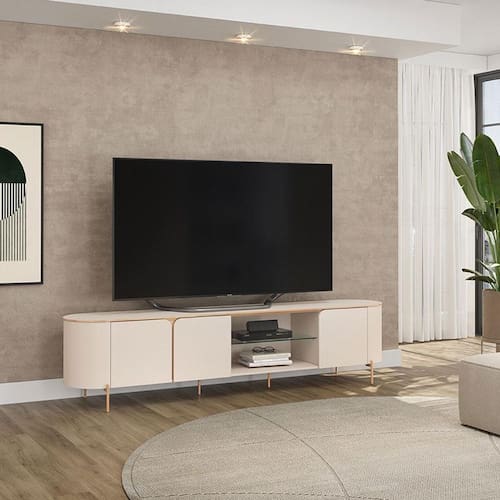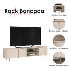 Está montado a sua sala? Apresentamos para você este belo rack da linha Ariana. Apresenta bordas arredondadas e três portas com cantos curvos, dando um visual moderno e suave. Possuindo uma prateleira em vidro para acomodar seus aparelhos eletrônicos, além dos pés em metal na cor dourado, garantindo charme e resistência. Fabricado pela DJ Móveis, é desenvolvido em 100% MDF proveniente de madeira de reflorestamento. Com capacidade para TVs de até 75 polegadas, será a escolha perfeita para compor seu ambiente com mais sofisticação e organização. Confira e aproveite!