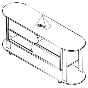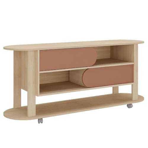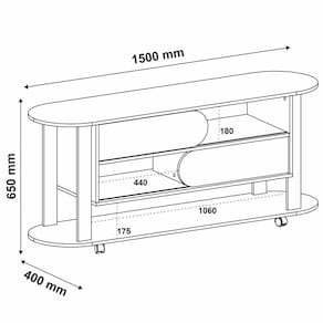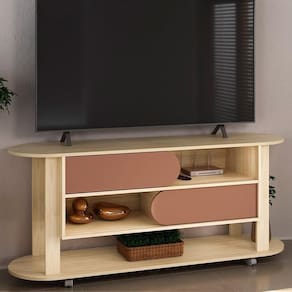 Características adicionais: Tampo suporta TV até 65 polegadas; 2 Portas de correr; Design ovalado; Rodízios para fácil movimentação.