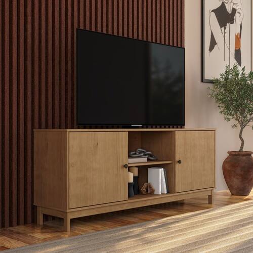 Características: Estrutura em Madeira Maciça Pinus Taeda de reflorestamento Pintura Semi-brilho 02 Portas com dobradiças de amortecimento Puxadores metálicos em ouro envelhecido Pés Retos em madeira maciça Prateleiras em madeira maciça (Peso suportado 10kg distribuídos) Ideal para TV de até 80 polegadas