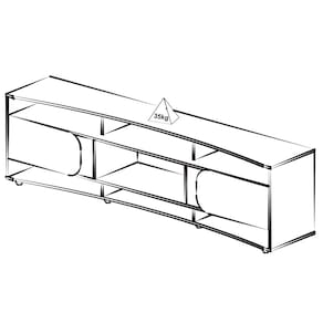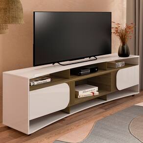 Características adicionais: Tampo suporta TV até 86 polegadas; 2 Portas com detalhes curvos e dobradiças metálicas; 7 Nichos para armazenar seus objetos; 8 pés de plástico para melhor distribuição de peso; contém 1 passa fio