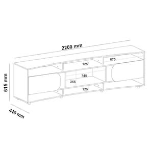 Características adicionais: Tampo suporta TV até 86 polegadas; 2 Portas com detalhes curvos e dobradiças metálicas; 7 Nichos para armazenar seus objetos; 8 pés de plástico para melhor distribuição de peso; contém 1 passa fio