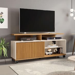 Rack Bancada Para TV Até 52 Pol. com Rodízios 1 Porta Topázio Cinamomo/Off White/Ripado - Bechara