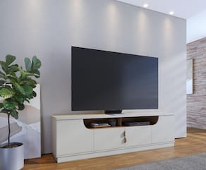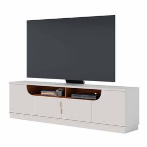 O tampo de 25mm garante robustez e suporta TVs de até 75 polegadas, com capacidade para até 30kg. Seu charme fica por conta das 04 portas de giro, sendo 02 com detalhe curvo, que trazem movimento e originalidade ao visual.