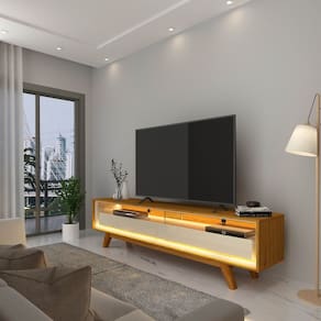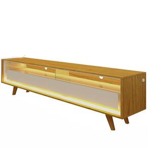 Estrutura: MDF/MDPAcabamento: Pintura U.VGaveta: Sim, 02 gavetas com bordas chanfradas e laqueadas, design flutuante e com corrediças telescópicas Luz de LED: Sim, Luz quente com difusor na parte superior e inferior do nichoNicho: Sim, com divisão em vidro de 8 mm Pés: Sim, incluso no produto em madeira maciça com detalhes abaulados Suporta TV: Ideal para TV de ate 75”Dimensões do produto montado