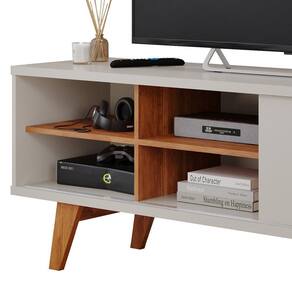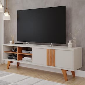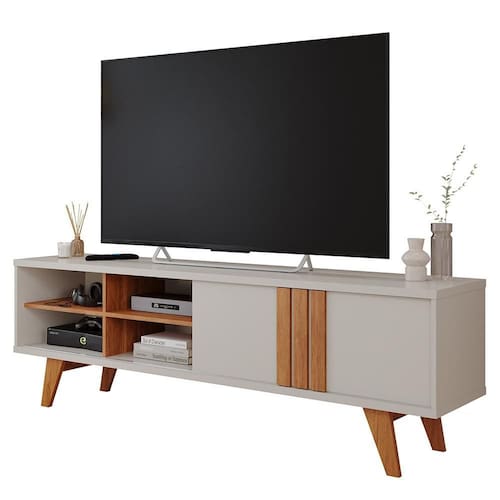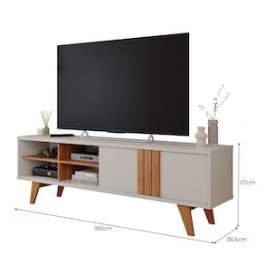 ESPECIFICAÇÕES: Estrutura em MDF Pintura UV 1 Porta deslizante Trilho em alumínio Detalhe ripado na porta Nichos Tampo e base de 25mm Pés retrô de madeira Ideal para TV até 60