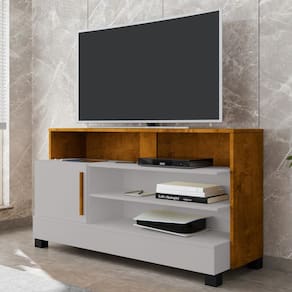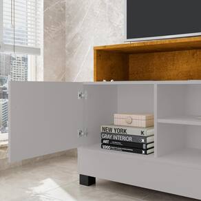 Rack Bancada Pipa, compacto, prático e com design moderno para sua sala. Estrutura em MDP (12/15mm) com acabamento em pintura UV texturizada. Possui porta basculante com dobradiças metálicas, puxador (MDF), pés em madeira maciça (Pinus) e nichos abertos. Suporta TV's de até 48 polegadas com segurança. Este produto será entregue em 1 volume.