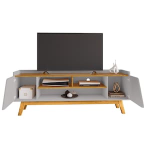 Rack Bancada Turim, linhas modernas que unem praticidade e elegância ao seu ambiente. Estrutura em MDP/MDF (15mm) com acabamento em pintura UV texturizada. Possui portas com dobradiças metálicas, detalhes chanfrados, nichos abertos e pés em madeira maciça (Pinus). Suporta TV's de até 65 polegadas com segurança. Este produto será entregue em 1 volume.