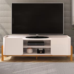 MDF/MDPRack bancada que oferece segurança e elegância para o seu ambiente de entretenimento. Estrutura em MDP/MDF, produzida a partir de chapas de madeiras reconstituídas de reflorestamentos. Suporta com segurança televisores de até 65 polegadas (peso máximo de 40 kg), também composta por tampo discretamente recuado (tipo bandeja) com cantos curvos, 4 nichos (sendo 1 central com prateleira), 2 portas usinadas com cantos arredondados, cantoneiras curvas frontais e dobradiças com amortecimento. Possui passa fios na parte traseira, 5 pés em madeira maciça que afastam o móvel do chão e sapatas plásticas. Acabamento em pintura UV texturizada fosca e alto brilho. Este móvel chegará em sua casa separado em 01 volume.