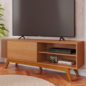 Design moderno e detalhes retrô, Rack Bancada Otawa é ideal para TVs de até 65 polegadas com segurança. Possui estrutura em MDP/MDF (12 e 15 mm) com acabamento em pintura UV texturizada (fosco/brilho). O tampo conta com detalhe chanfrado, porta de correr com ripado decorativo (alto relevo), prateleira funcional e passa fios embutido. Os pés são em madeira maciça, no estilo retrô que valoriza qualquer ambiente. Este produto chegará em sua casa separado em 1 volume.