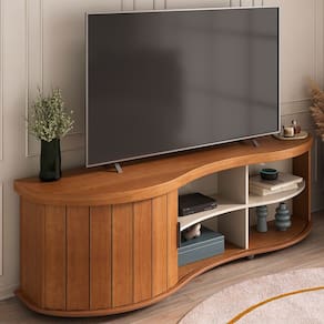 Tamburato 50mm / MDF 15mm / MDP 15mmO Rack Bancada 180cm Para Tv 75” combina tecnologia e funcionalidade para seu ambiente. Seu tampo curvo em Tamburato de 50mm é robusto, e adiciona um toque sofisticado ao design. A porta ripada deslizante acompanha o formato curvo e conta com a opção de montagem reversível na instalação, permitindo escolher a cor que melhor se adapta ao seu espaço. O puxador em alumínio reforça a sofisticação do móvel. Este móvel chegará em sua casa separada em 01 volume.