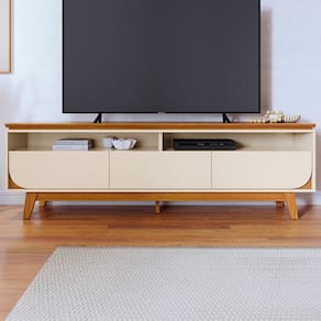 MDPRack Bancada Selene, com design funcional e detalhes usinados que transformam o ambiente. Estrutura em MDP 15/25 mm, (base 15mm e tampo/rodapés/pés em 25mm) suportando TVs de até 75 polegadas com segurança (TV NÃO INCLUSA). Conta com tampo suspenso com bordas chanfrada, 3 gavetas com corrediças telescópicas (gavetas laterais com frente em detalhe curvo) e puxadores tipo cava, 2 nichos centrais, passa-fios e 4 pés usinados com sapatas plásticas. Acabamento em pintura UV texturizada (fosco e brilho). Este móvel será entregue em 02 volumes.